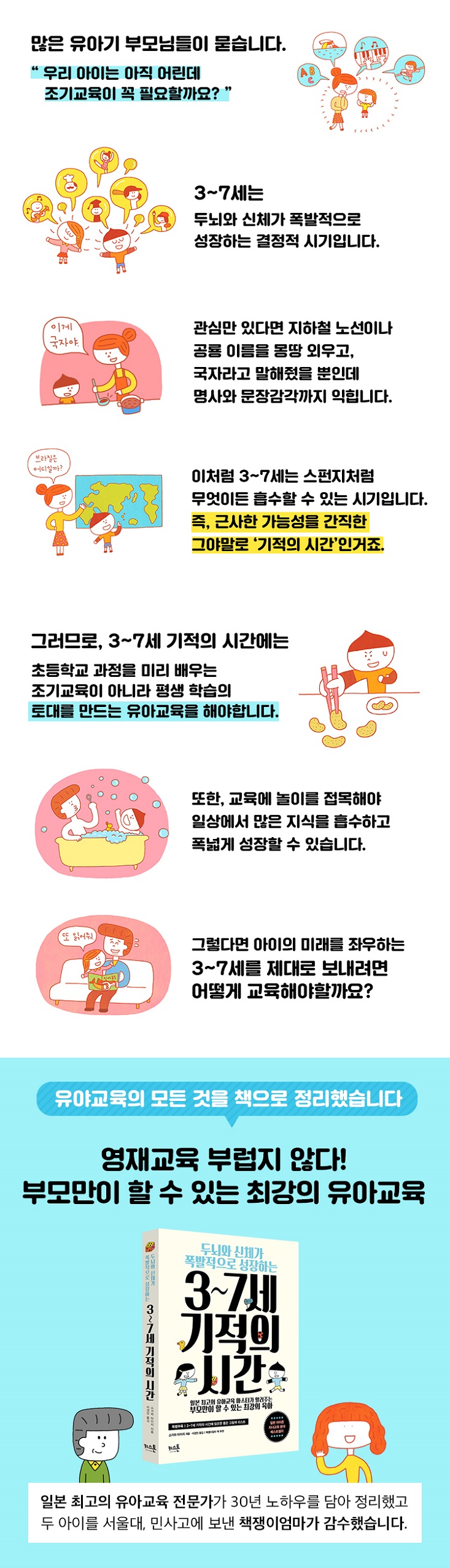 이렇듯 3~7세는 ‘근사한 가능성’을 간직한 ‘기적의 시간’이다. 3~7세 아이들의 이러한 가능성을 기적으로 바꾸려면 어떻게 해야 할까? 그 방법이 《두뇌와 신체가 폭발적으로 성장하는 3~7세 기적의 시간》에 자세하게 안내되어 있다.